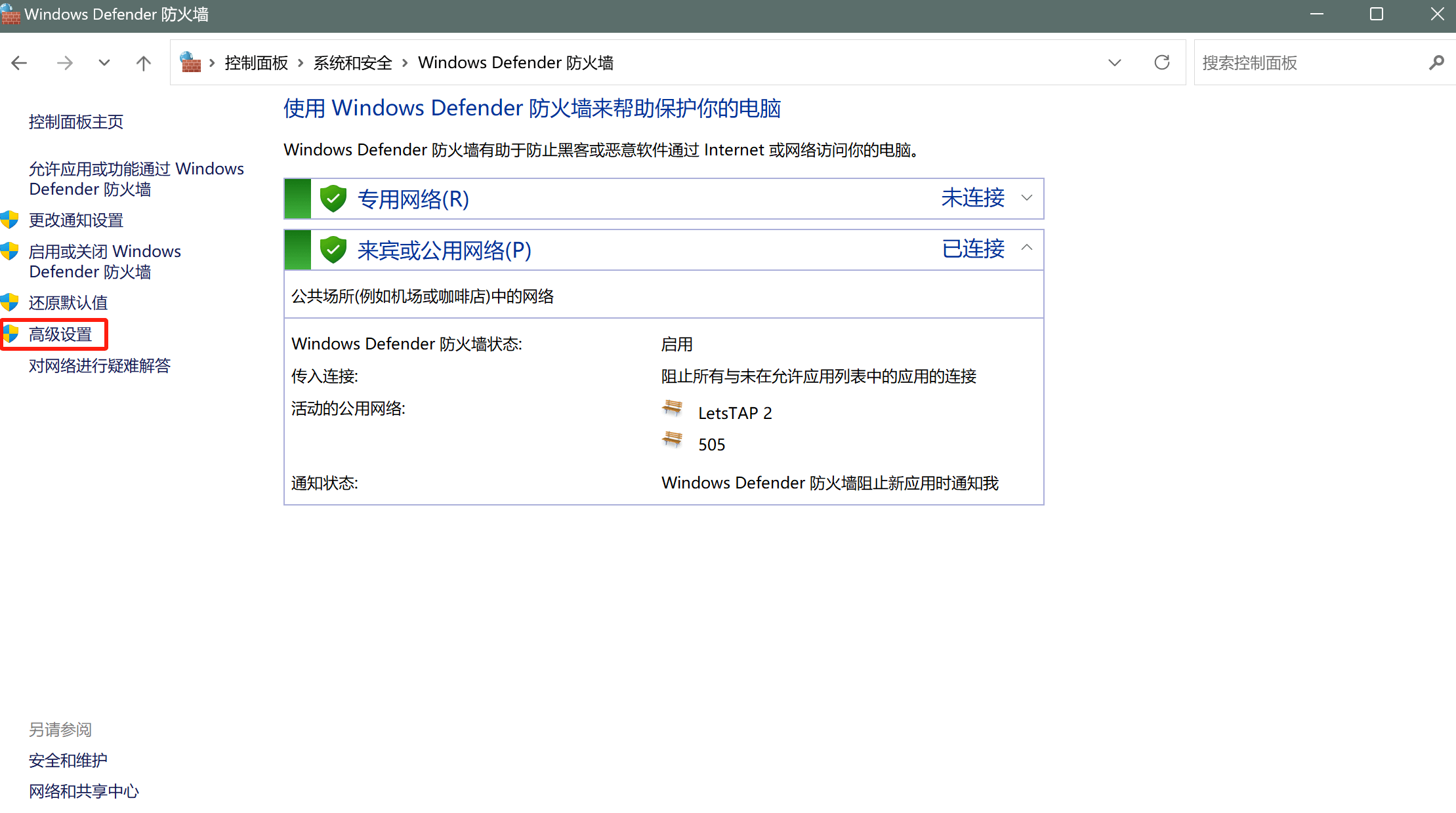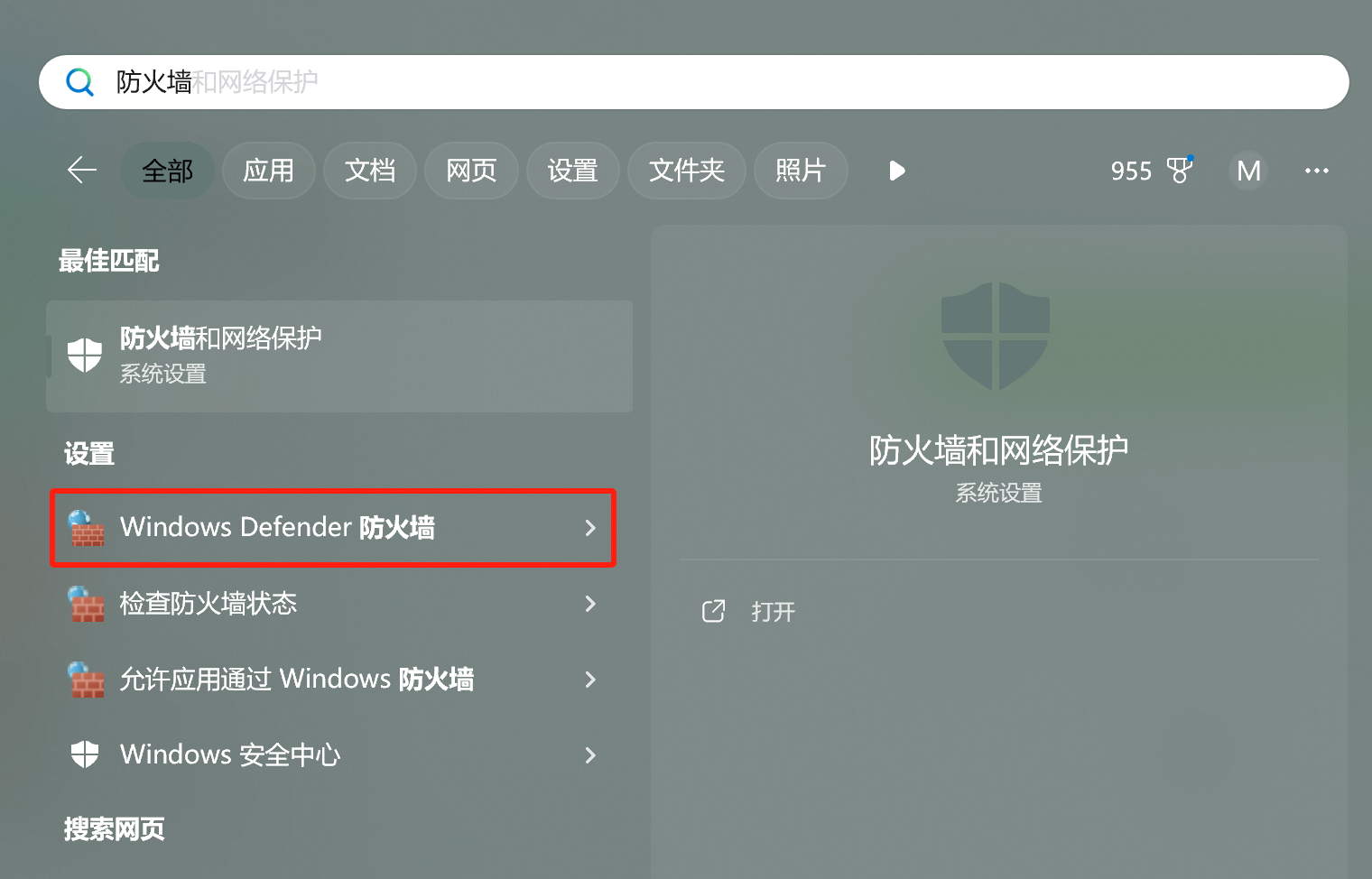 - 如网络连接正常,按win键搜索防火墙。点击Windows Defender 防火墙